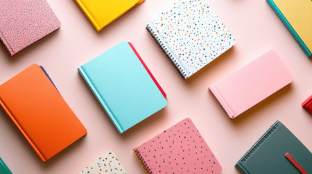 A visually appealing collection of various notebooks and journals in soft colors, arranged flat on a white surface. Ideal for creative projects, design inspiration, and stationery showcases.