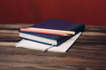 Education Creativity concept. Red, blue and black notepads on a light wooden background, close up