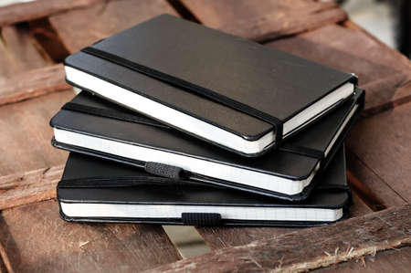 black notepads on brown wood table background