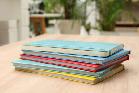 Stack of colorful planners on wooden table indoors