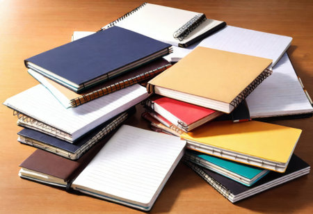 A set of multicolored notebooks with different sizes and designs, arranged in a visually pleasing pattern on a neutral-colored background.