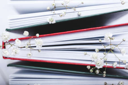 Books with fresh flowers, closeup