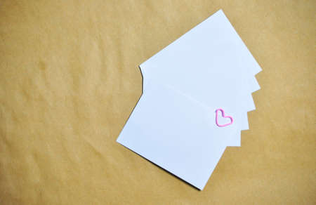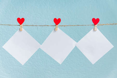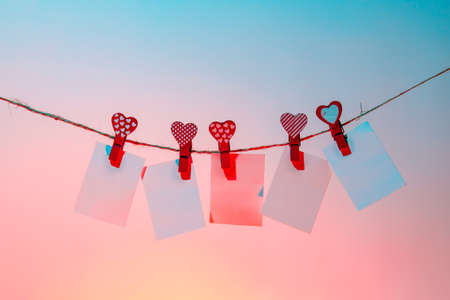 5 white pieces of paper red clothespins with a heart on a rope. Valentine's Day love. blue-pink background. copy space. mocap