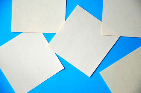Multi-colored stickers for notes, reminders. On a blue background, stickers on the right and 5 pieces across the screen. Place for text. COPY Space