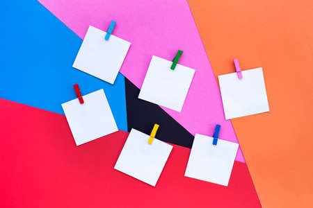 Five blank sticky notes on red paper background or on the board
