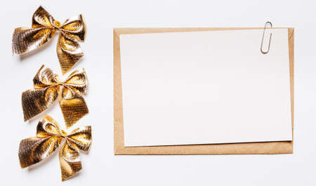 Blank note with envelope, bow and gold pen on white background