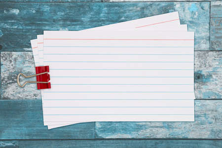 Retro white paper index cards with paper clip on weathered wood with copy space for your message