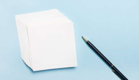 On a light blue background, a stack of notes and a pen. Template. Copy space