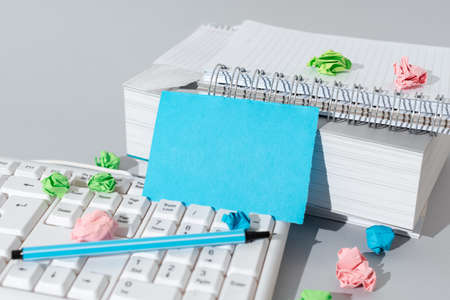Important Message Presented On Piece Of Paper On Desk With Keyboard, Books, Notebook, Paperwraps And Pen. Crutial Information Written On Note. New Ideas Displayed On Memo.