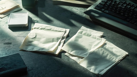 A modern office desk scene featuring neatly stacked paper files and a computer keyboard. Natural light casts soft shadows, creating a professional workspace atmosphere.