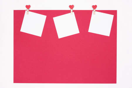 Blank white note paper sheets with heart shaped pins. Copy space. Romantic Valentines Day minimal background
