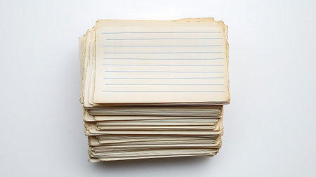 High-angle studio shot displays a thick stack of aged index cards with horizontal blue lines against a seamless white backdrop, showcasing texture and detail.
