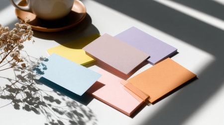 A table with a white background and a cup of coffee. There are six colorful cards on the table
