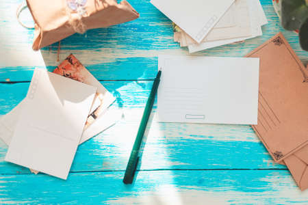 Composition of empty postcards, pen, craft envelopes, and parcel. Blue wooden background. Flat lay. Copy space. Concept of mail and postcrossing.