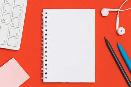 Open blank journal on red background. Concept for creative person planning. Back to school. Top view, flat lay, mockup