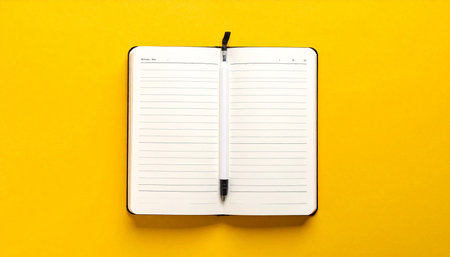 Communication showing open lined notebook with a pen clipped to the spine on a vibrant yellow background keywords: notebook, open, lined pages,...