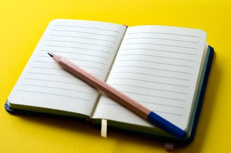 Close up picture of a wood black pencil crayon over a white paper diary before a blue paper background