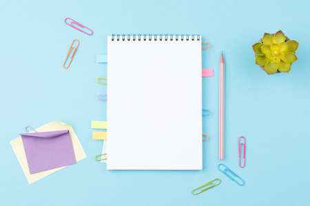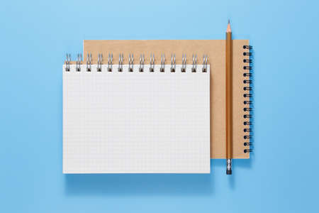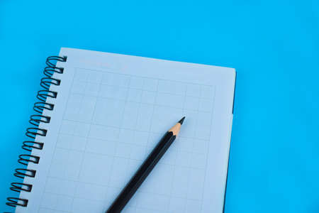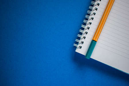 top view of a open notebook with pencil on a blue background, school notebooks with a spiral spring, office notepad flat lay