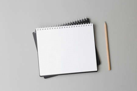 top view of a open black notebook with pencil on a gray background, school notebooks with a spiral spring, office notepad flat lay