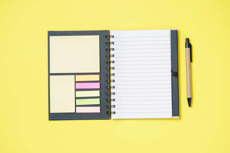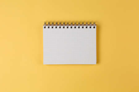 notebook on a yellow background top view, blank sheet for writing purposes, business concept flat lay