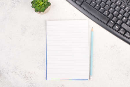 Top view of simple office desk with computer keyboard, pen and blank notepad. Copy space