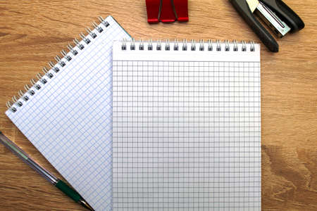two open notepads a fountain pen a stapler and a stationery clip on the table. High quality photo