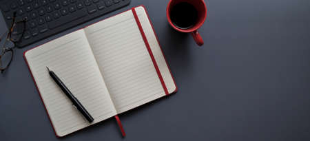 Top view of dark modern workplace with open notebook and red coffee cup on dark grey background