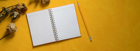 Top view of creative workspace with open blank notebook, pencil, dry roses and copy space on yellow concrete background