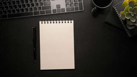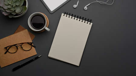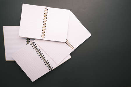 A mockup of an empty spiral notepad paper on modern black office table. Education and business objects. Overhead shot, flat lay.