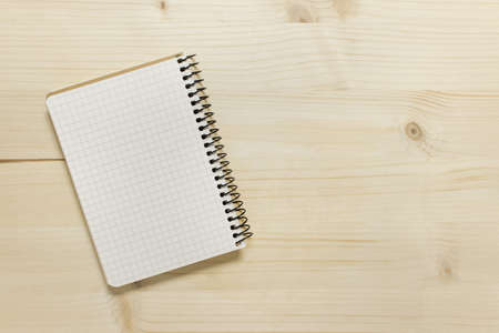 Opened squared lined spiral notebook on wooden table. Photo with copy blank space.