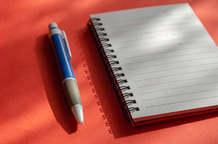 Opened notepad and blue pen on a red background with shadows. Spring notepad with blank white sheets. Side view at an angle. Close-up, selective focus.