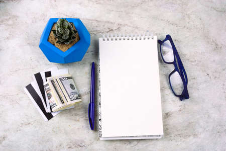 top view flat lay notebook with blank white sheet , pen, money,credit cards, glasses and succulent on a marble table