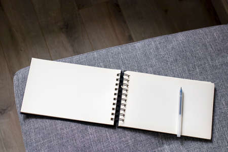 An open white notebook with springs lies on a gray sofa. Space for text