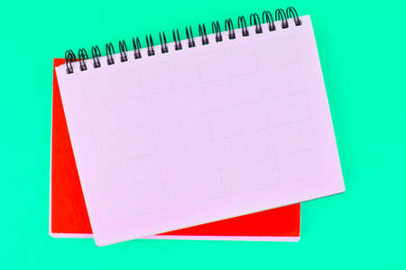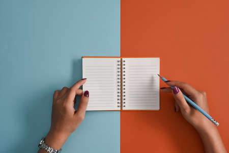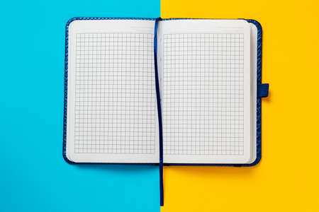 A copy space image of an empty notebook photographed from a top down perspective on a bicolor background