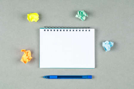 Conceptual of taking notes with pen, notebook, torn notes on gray background top view. space for text horizontal image