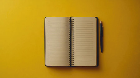 An empty notebook placed on a vibrant yellow background beside a pen. Ideal for themes of education, planning, and creativity, this image captures simplicity and focus.