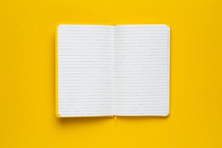 Notebook with a blank pages on a yellow background top view