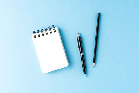 Business background with empty notebook and pens on blue table. Office desktop