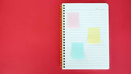 Top view of an open blank red notebook in the bottom corner with a green pen on top of it and a blue pen beside it, colored reminders in high corner in a red background, with space for text