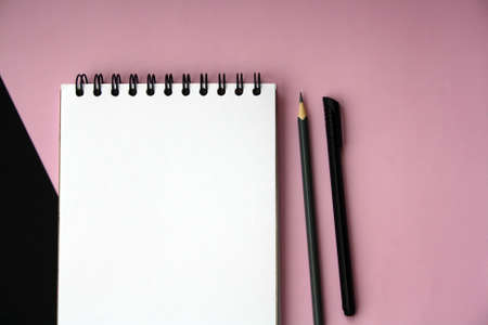 Open blank journal on pink background. Concept for creative person planning. Back to school. Top view, flat lay, mockup
