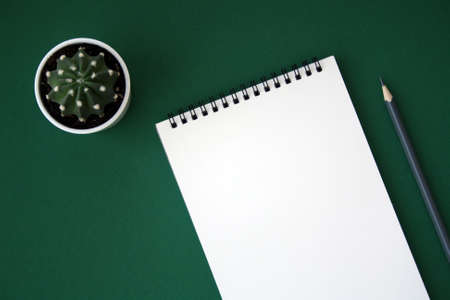 Planner layout, open blank spiral notebook for design, lettering, text, template. On green background whith pencil and cactus. Space for text.