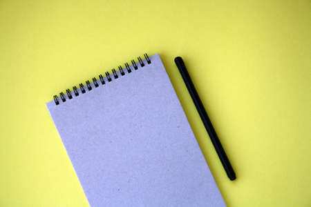 School notebook on a paper yellow background, spiral notepad and craft cardboard pen