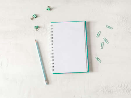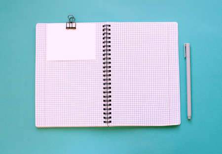 Notepad for notes is open on a blank page. Stationery, note paper.