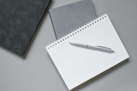 Notebooks or diaries with a blank page and a ballpoint pen on top of them. Office worker's place