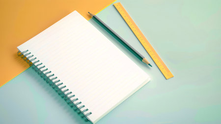 A new, blank notebook with a spiral binding lies open on a table, inviting creativity. A pencil and ruler rest beside it, ready for the start of a new school year or project.