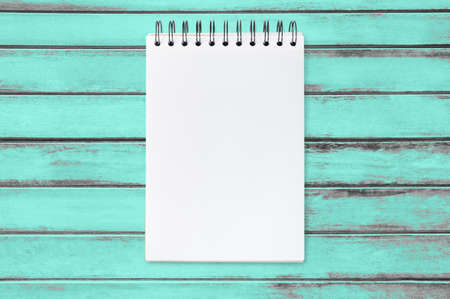 Blank notebook page is on top of light blue vintage wood table, flat lay.