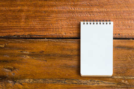 Note book on wooden table. Space for text. Flat lay and top view