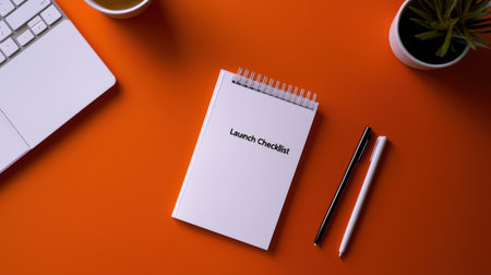 A flat lay of startup essentials like business cards, prototype designs, and a Launch Checklist notebook