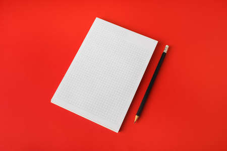 Blank stationery mockup. Blank copybook and pencil on red paper background. Template for placing your design.