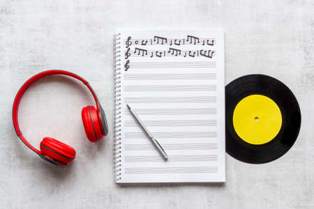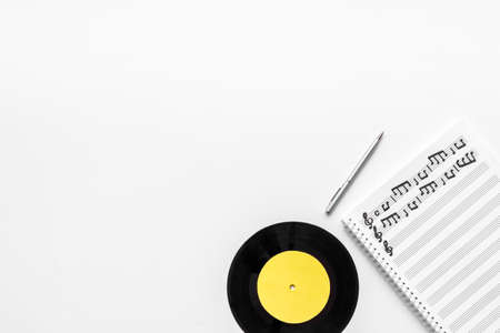 Handwritten music sheets and vinyl record, top view. Compose music concept